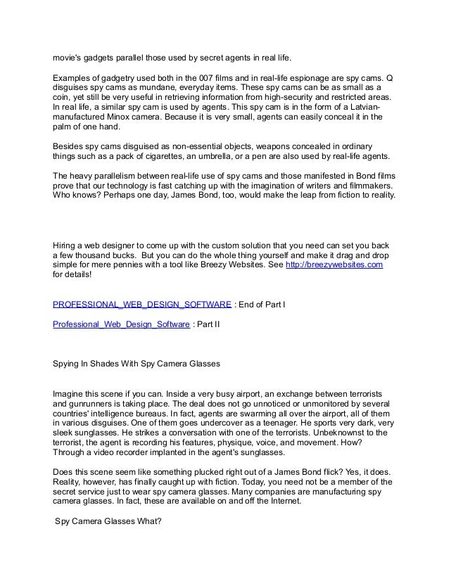 The heavy parallelism between real-life use of spy cams and those manifested in Bond films prove that our technology is fast catching up with the imagination of writers and filmmakers. Who knows? Perhaps one day, James Bond, too, would make the leap from fiction to reality.